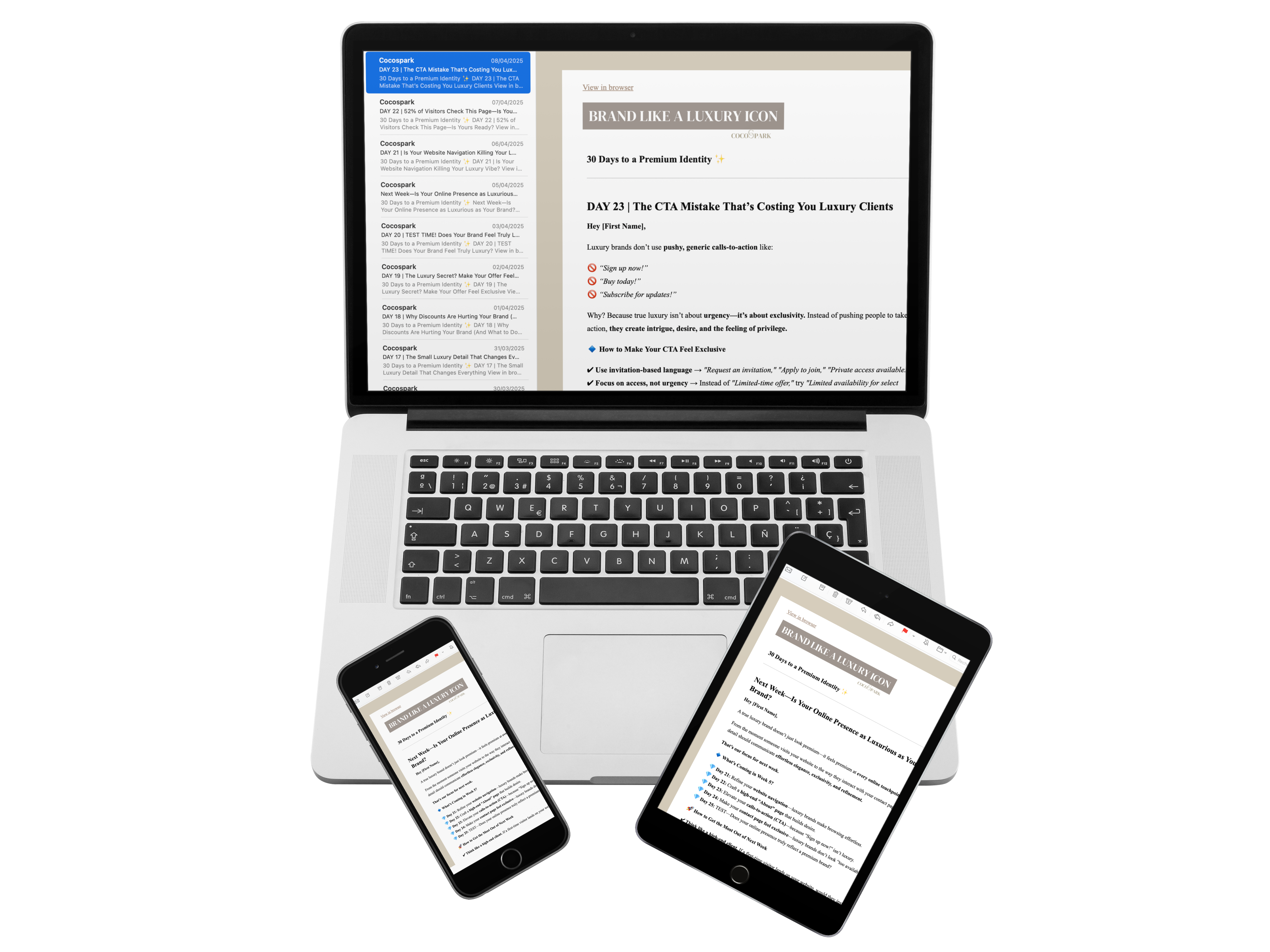 Receive one exclusive branding tip per day, directly in your inbox. This 30-day email series helps you refine your visual identity, messaging, and brand perception to achieve a high-end, luxury feel—effortlessly.